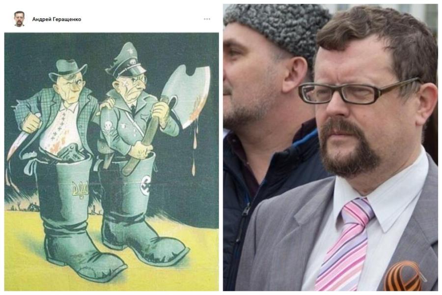 У сваім артыкуле “Украина во мгле нацизма” ен сцвярджае, што “без освобождения Украины от бандеровской власти и присоединения её к союзу России и Белоруссии не будет нормальной жизни ни в России, ни в Белоруссии, а уж в самой Украине не будет жизни вообще никакой”. Палітычныя погляды Андрэя Герашчанкі выразна ілюструюць знакамітую прымаўку “хоча быць свяцейшым за Папу Рымскага” – так гавораць пра людзей, беспадстаўна адданых нейкай ідэі. Справа ў тым, што рускай крыві ў жылах Андрэя Герашчанкі – ані кроплі: ягоная маці – украінка з Хмяльніцкай вобласці, тата – беларус, ураджэнец Гарадоцкага раёна Віцебшчыны. Але сябе Герашчанка лічыць сябе рускім - “русским писателем, человеком русской культуры”. Ягонае палітычнае крэда ў тым, што “русские, украинцы и белорусы – один большой русский народ, а Россия, Белоруссия и Украина – части Русского мира”.