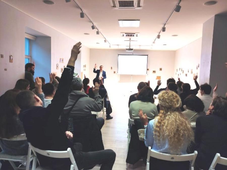 На пачатку сустрэчы палітык прадставіў прэзентацыю пра БХД і патлумачыў, чаму, на яго думку, гэтая плынь з’яўляецца адным з ключавых «матэрыкоў» беларускай гісторыі і палітыкі.
