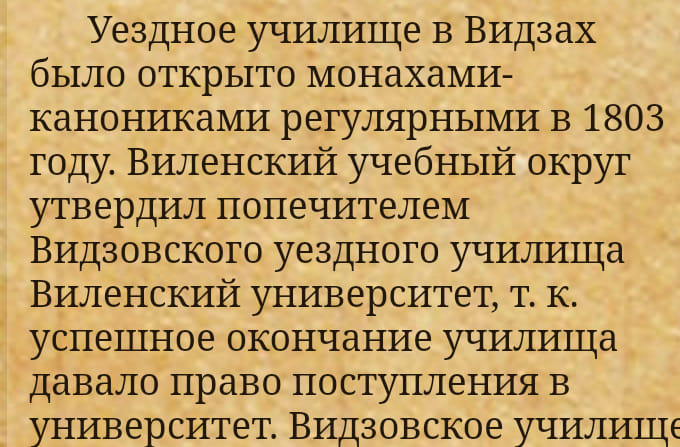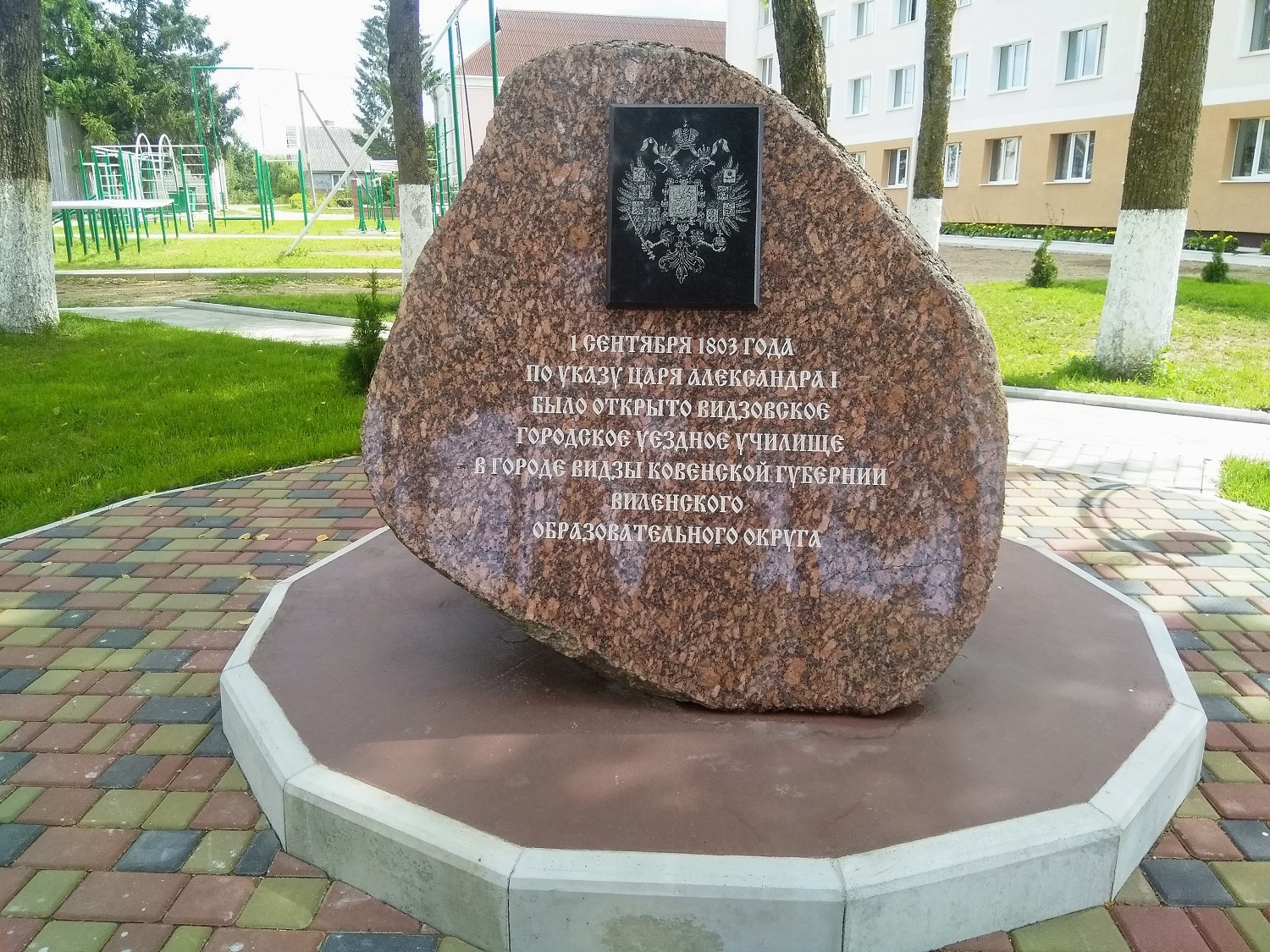 “1 верасьня 1803 году па ўказу цара Аляксандра І было адкрытае Відзаўскае гарадзкое павятовае вучылішча ў горадзе Відзы Ковенскай губэрні Віленскай адукацыйнай акругі”, – выбіта на камяні па-расейску.